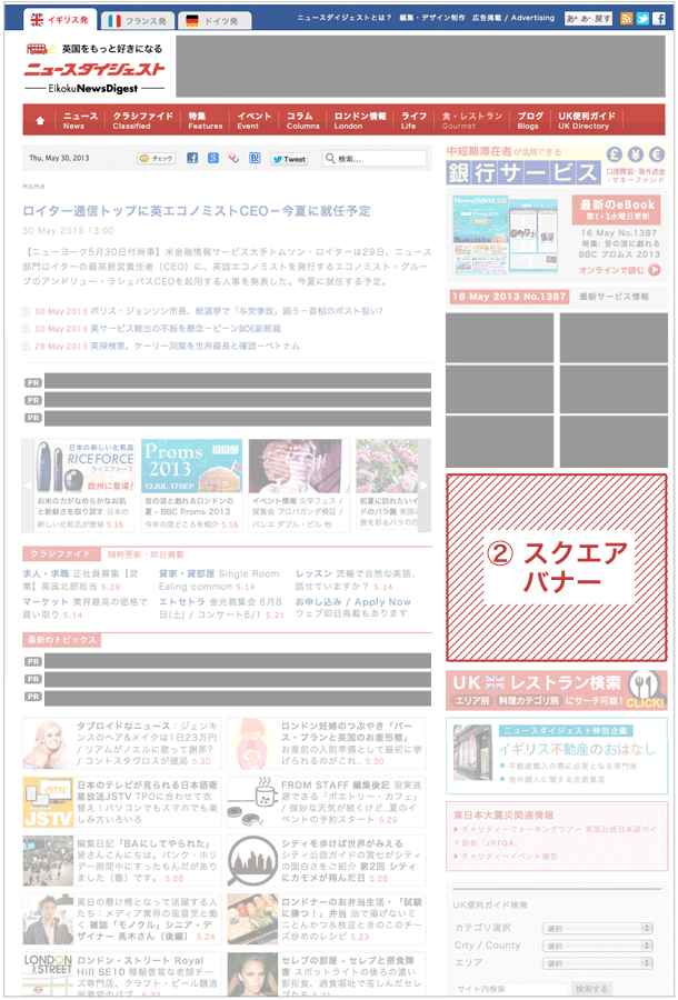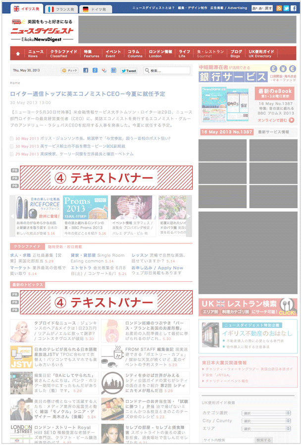 各種バナーの中で最も多くのページに表示され、英国ニュースダイジェスト掲載のバナーの中で最大のインプレッション数を期待出来るバナーです。ページを開く度に表示位置が枠内でランダムに変わり、右カラムがマンネリ化して見えてしまうのを防いでいます。