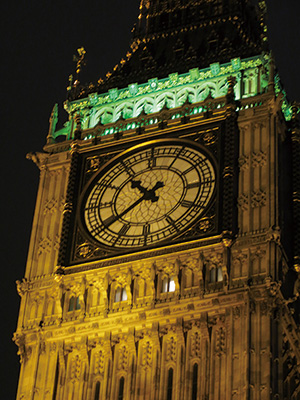 もし、シンデレラがその場にいたら顔面蒼白です。移行後の時刻に合わせて午前零時から時計の針が動き出しますが、まだ表面は暗く、鐘も鳴りません。塔内ではまだ点検作業が続きます。そして移行時刻の午前2時。パッと電燈が点いて鐘が鳴り始め、無事に復旧。何時間も時計を止めて調整しているのかと思いきや、毎年2回、わずかな時間でこのような調整作業が行われているのです。鐘の鳴らない静かな夜、魔法をかけられたビッグ・ベンが眠るわずかな時間。