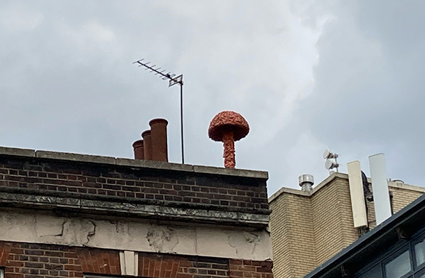 シティの東、ショーディッチを歩いていたら建物の屋上に大きなキノコのオブジェがありました。これはロンドンで活動する南ア出身のストリート・アーティスト、クリスチャン・ナーゲル氏が食料危機を訴えて、10年ほど前に欧米各国に設置したものです。軽量のポリウレタンでできていますが、遠くからは屋上にキノコが生えているように見えます。ただし、不動産所有者の許可なく設置したので、今ではその多くが撤去されてしまいました。