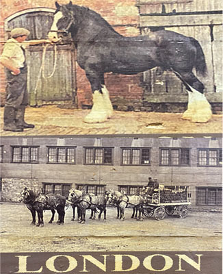 ところでカムデンの貨物ターミナルで大活躍したのが荷馬です。中でもシャイヤ種と呼ばれる英国原産の大型馬でした。ギルビー社の創業者ウォルター・ギルビー卿はジンだけでなくほかの酒類も販売していたので、カムデンの貨物ターミナルや近隣の地下室をお酒や酒瓶の貯蔵に使っており、それらを四方八方移動させるのにシャイヤ種が大活躍しました。ギルビー卿はシャイヤ種の品種改良や畜産農業に貢献した慈善家でもありました。