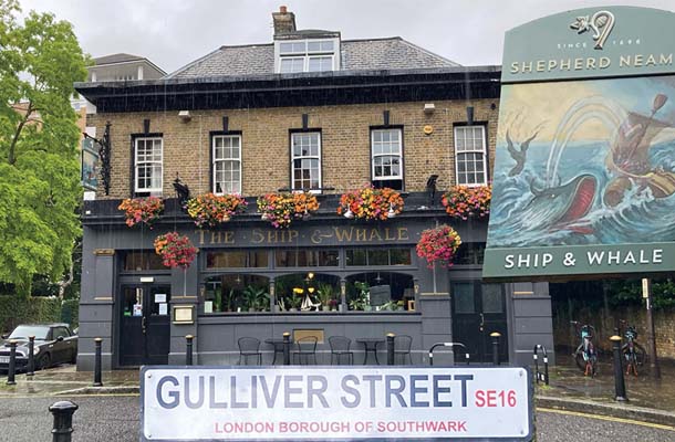 一方、18世紀初めに捕鯨が再開されると、グリーンランド近海で捕獲された鯨はこのドックで荷揚げされました。120隻の船を係留できたので捕鯨船団の基地になり、そのころ「ガリバー旅行記」が書かれました。鯨の脂肪や巨大な歯や骨を原料にした製造工場が立ち並び、やがてドックはグリーンランド・ドックと改名されました。そのドックで捕鯨業に従事する人たちの憩いの場がガリバー通りにあるパブ「船と鯨」です。