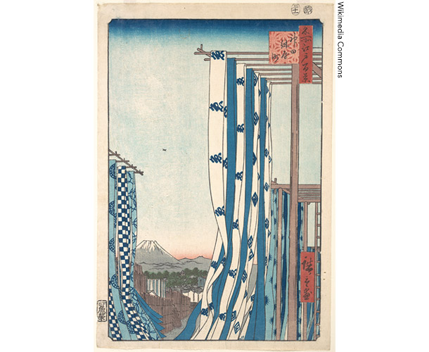 そこで思い出したのが浮世絵で絶賛された葛飾北斎や歌川広重のブルーです。日本では6世紀ごろから蓼藍を使った藍染めが盛んでした。ところが18世紀初頭、ドイツが金属イオンの化学変化による染料を発明し、北斎や広重が積極的に浮世絵に使用しました。広重の作品「名所江戸百景」に藍染めの町、神田紺屋町の風景が描かれていますが、その藍色は植物由来ではなく、ドイツの化学染料です。一方、石炭から染料を発明したのは英国のW・パーキン青年で、次号で詳しくお話ししたいと思います。