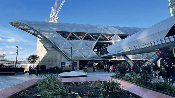 この駅ビルを設計したのはノーマン・フォスター卿。地下鉄ジュビリー線のカナリー・ワーフ駅の出入口やシティの高層ビル、ガーキン、大英博物館のグレート・コートも設計しました。駅ビルの屋上にはクロスレール・プレイスと呼ばれる庭園があり、その天井に敷き詰められた三角形の木枠にはガラスに代わる新素材として注目されている、熱可塑性フッ素樹脂(ETFE)でできたピロー(空気入りの薄膜)が張られています。
