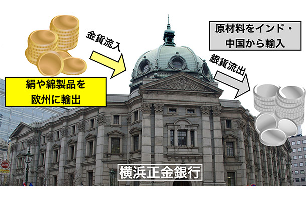当時の外国為替管理を担った横浜正金銀行は、日本が欧州向けに茶や綿製品、絹を輸出して金貨を稼ぎ、インドや中国から輸入した原材料費を銀貨で払うことで日本の金貨蓄積を目指していました。ところが、金本位制の欧州から戦艦をはじめとする軍備品を購入すればたちまち金貨が流出します。