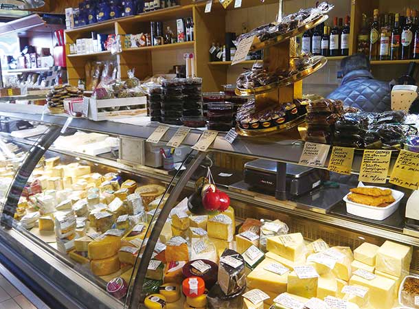 ウナギの寝床さながらの細長い店内。それと同じくらい長さのあるガラス・ケースには、英国を始めとする欧州産のチーズがギッシリ。テクスチャーや熟成度も様々で、手ごろな値段のものからトリュフ入りの高級品までが並ぶ。迷ったら好みを言ってアドバイスをもらうのが早道。この地に店を開いて10年のご主人が気軽に相談にのってくれる。もちろん味見をしてから選べるので、新しいチーズに挑戦しては。