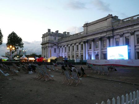 ロンドン南東部グリニッジのパブリック・ビューイング施設はビーチリゾートみたい