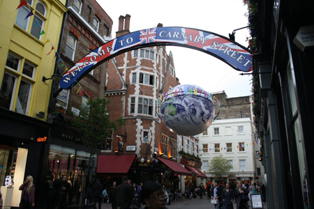 ロンドン中心部のカーナビー・ストリートにて。ちなみにこのアーチは、ダイヤモンド・ジュビリーでも使用している「リサイクル」もの。写真: 小林咲子