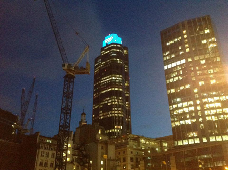 夜のシティ(バンク駅付近)、Tower 42のてっぺんに浮かび上がる五輪マーク。赤、ピンク、青と色が変わります。