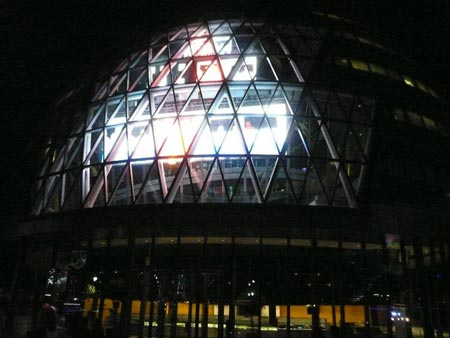 光のイルミネーションに照らされるロンドン市庁舎