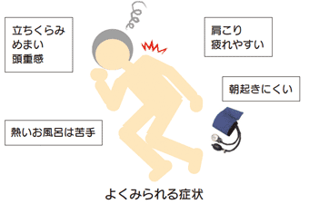 早起きが苦手、熱いお風呂がつらい、頭重感、立ち眩み、めまい、だるさ、活力が湧かない、などです。血圧値が低くても平気な人もいます。低血圧に伴う諸症状は、貧血(Anämie)の症状と似ていますが、前者は循環器系の病態で、後者は血液中の赤血球の量が問題です。若い女性は、軽度の鉄欠乏性貧血と低血圧を併せ持っていることもあるので、あまりにも立ち眩みやだるさが酷い場合は、調べてもらいましょう。